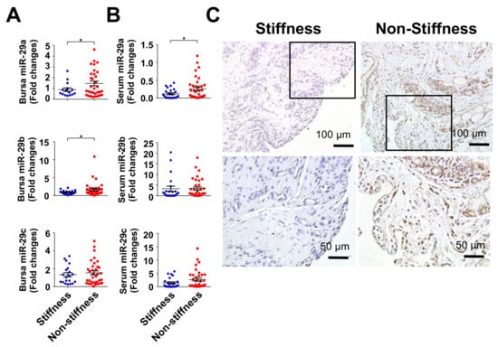 Analysis of miR-29 expression in subacromial bursa and serum. miR-29a and miR-29b expression were decreased in subacromial bursa in the stiffness group (A). Serum miR-29a rather than miR-29b and miR-29c levels were significantly downregulated in the stiffness group (B). Cells within subacromial bursa specimens in the stiffness group displayed weak miR-29a transcripts (brown) as compared to the non-stiffness group as evident from in situ hybridization (C). The boxes stand for selected regions of interest for high-power field images shown in right panels. Data are expressed as mean ± SEM from 22 patients with stiffness and 35 patients without stiffness. Asterisks (*) indicate significant differences between stiffness and non-stiffness group analyzed using Wilcoxon test (p < 0.05).