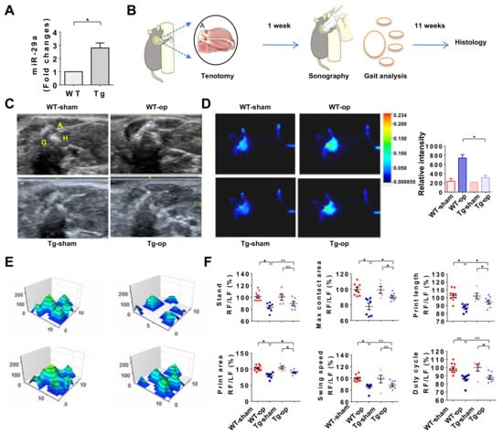 Analysis of rotator cuff lesion and gait profiles of wild-type mice and miR-29aTg mice. miR-29a expression was significantly increased in miR-29aTg mice (A). Schematic drawings for surgery-induced rotator cuff injury in mice (B). Echogenicity of injured shoulders was compromised in miR-29aTg mice (C). Inflammation in the injured tendon as evident from fluorescence 2-deoxyglucose uptake was downregulated in miR-29aTg mice (D). The tenotomy-mediated irregular footprint histograms (E) along with decreased stand time, maximum contact area, footprint length, footprint area, swing speed, and duty cycle (F) of forelegs with injured shoulders were improved in miR-29aTg mice. Data are expressed as mean ± SEM from 6–9 mice analyzed using ANOVA test and Bonferroni post-hoc test. Asterisks * (p < 0.05) indicate significant difference between groups. A, acromion; G, glenoid; H, humeral head; Op, tenotomy surgery; RF, right forelimb; LF, left forelimb; NS, not significant.