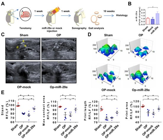 miR-29a precursor treatment improvement of shoulder injury. Schematic drawings for miR-29a precursor treatment for shoulder injury (A). miR-29a expression was increased at 1 week upon miR-29a precursor treatment (B). Echogenicity of injured shoulder was compromised upon miR-29a precursor treatment (C). Tenotomy-mediated irregular footprint (D) along with stand time, maximum contact area, footprint length, and footprint area (E) were improved upon miR-29a precursor treatment. Data are expressed as mean ± SEM from 5–6 mice. Asterisks * (p < 0.05) indicate significant difference between groups analyzed using ANOVA test and Bonferroni post-hoc test. A, acromion; G, glenoid; H, humeral head; Op, tenotomy surgery; RF, right forelimb; LF, left forelimb; NS, not significant.