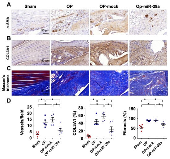 Histopathological analysis of injured shoulders with or without miR-29a precursor treatment. Injured sites in the miR-29a-treated group showed moderate α-SMA immunostaining (brown) (A) and COL3A1 immunoreaction (brown) (B) along with mild fibrosis tissue formation (blue) as evident from Masson’s trichrome staining (C). The tenotomy upregulation of vessel formation, COL3A1 production and fibrotic tissue area were compromised upon miR-29a precursor treatment (D). Data are expressed as mean ± SEM from 5–6 mice analyzed using ANOVA test and Bonferroni post-hoc test. Asterisks * indicate significant difference between groups (p < 0.05).