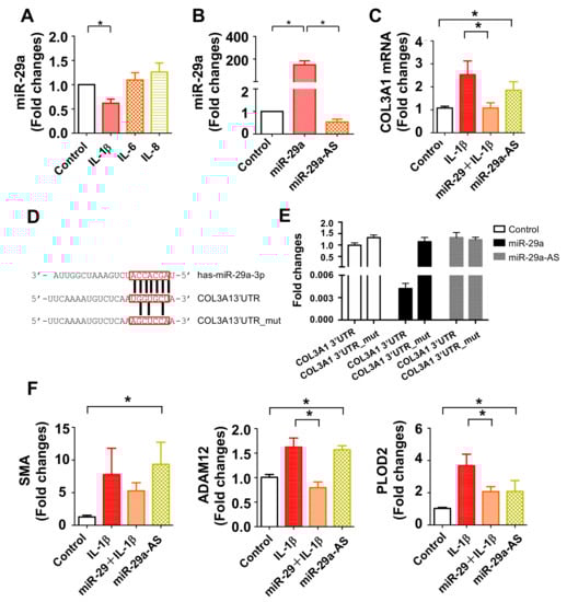 Analysis of miR-29a action to human tenocytes. IL-1β rather than IL-6 and IL-8 significantly decreased miR-29a expression in tenocytes. Cell cultures were incubated in 1 ng/mL IL-1β, IL-6, or IL-8 for 24 h (A). miR-29a expression was increased in tenocytes upon miR-29a precursor transfection, whereas miR-29a antisense oligonucleotide (miR-29a-AS) transfection reduced the expression (B). miR-29 precursor transfection attenuated the IL-1β-mediated COL3A1 expression. miR-29a knockdown alone provoked COL3A1 expression (C). Sequence (red boxes) of the miR-29a targeted 3′-untranalated region (3′-UTR) and 3-base pair mutant of COL3A1 were constructed for luciferase reporter assay (D). miR-29a precursor transfection decreased luciferase reporter activity of 3′-UTR rather than mutant of COL3A1 in tenocytes, whereas miR-29a-AS transfer increased the luciferase reporter activity (E). miR-29a precursor attenuated the IL-1b-augmented SMA, ADAM12, and PLOD2 expression. miR-29a-AS increased fibrosis marker expression in tenocytes (F). Data are expressed as mean ± SEM calculated from three experiments analyzed using ANOVA test and Bonferroni post-hoc test. Asterisks * indicate significant difference between groups (p < 0.05).