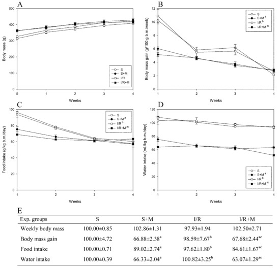 Time-course curves of: (A) weekly body mass (g); (B) body mass gain (g/100 g b.m./week); (C) food intake (g/kg b.m./day); and (D) water intake (mL/kg b.m./day, E): the area under a curve values (% of sham) of weekly body mass, body mass gain, and food intake and water intake. Group categories abbreviations: S—sham operated rat group; S + M—sham operated + meldonium rat group; I/R—ischemia/reperfusion rat group; I/R + M—ischemia/reperfusion + meldonium rat group. Number of animals per experimental group: n = 8. The data are given as mean ± standard error. Minimal significant level: p < 0.05. Significantly different: a in respect to S; b in respect to S + M; c in respect to I/R group.