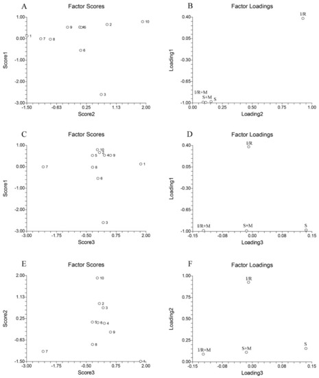 As can be seen from our results, the sum of C22:6 and C22:1 exhibits the highest positive value, whereas C16:0 exhibits the highest negative value (Figure 4A, numbers 10 and 3). Combining this data with the data from Figure 4Bs loading plot, it can be concluded that C16:0 has the highest influence on the separation of the I/R group relative to the S, S + M, and IR + M groups (Figure 4B). The greatest differences between C14:0 and C18:1 c + t (Figure 4C, numbers 1 and 7) is that the highest influence on the separation between the S and S + M groups (Figure 4D) had the C14:0 while the highest separation influence between the I/R + M and S + M groups (Figure 4D) had the C18:1 c + t. Finally, the greatest differences between C18:1 c + t and C22:6 relative to rests of fatty acids (Figure 4E, numbers 7 and 10) confirmed that the highest influence on the separation of the I/R group relative to the S, S + M, and IR + M groups (Figure 4F) had the C22:6, while the highest influence on separation between the I/R + M and S + M groups (Figure 4F) had the C18:1 c + t.