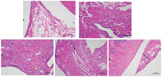 Histopathological evaluation of different treated groups. (a) Blank group. (b) Model group. (c) Positive control group. (d) High dose group. (e) Low dose group. The black and yellow arrows pointed to inflammatory cells.