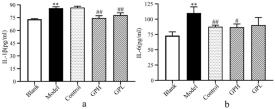 The results of biochemical indicators. (a) Changes of IL–1β in plasma of different groups. (b) Changes of IL–6 in plasma of different groups. (**: Significantly increased compared with blank group (p < 0.01); #: Significantly decreased compared with model group (p < 0.05); ##: Extremely significantly decreased compared with model group (p < 0.01).