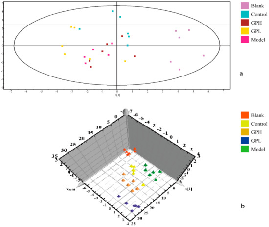 In the experiment, unsupervised PCA of the original data was first performed, and the most realistic metabolic differences between the reaction groups were obtained. As shown in Figure 4a, the separation was not ideal, and we performed PLS–DA analysis. The data were again subjected to supervised metabolomic analysis. The result was shown in Figure 4b. The blank and model groups were clearly separated in the three-dimensional figure, indicating that the modeling was successful, and the endogenous metabolites in the model group had been obviously changed. The results for the high-dose and control groups were moderate between those of the blank and model groups, and there was overlap between the high-dose and positive control groups, indicating that Gout Party had an effect on rats metabolism.