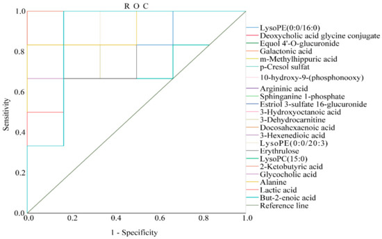 In this experiment, we validated the diagnostic significance of the identified biomarkers via receiver operating characteristic (ROC) curve analysis. The ROC curve was based on a series of different two-category methods (demarcation value or decision threshold), with the true positive rate (sensitivity) as the ordinate and the false positive rate (1−specificity) as the abscissa. The area under the ROC curve (AUC) is usually used as an indicator of diagnostic efficiency. AUC > 0.85 indicates that the biomarker can be considered more diagnostic. In this experiment, the ROC curve was used to study the ability of these AGA biomarkers to diagnose AGA in rats. Of all the results, only two of the biomarkers had an area under the curve of less than 0.85, which were p–cresol sulfate 0.736 and erythrulose 0.778, respectively, and the remaining 20 substances were all greater than 0.88, demonstrating that the biomarkers had good diagnostic significance. (Please see Table S1 in Supplementary Materials for details.) The ROC curves of the AGA biomarkers were shown in Figure 5.