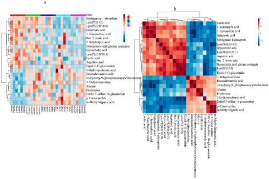 (a)Heatmap metabonomic data depicting the data structure of 22 biomarkers. The depth of the color represents the size of the variable. (b) Correlation metabonomic data depicting the data structure of 22 biomarkers. Red or blue represents the positive or negative correlation coefficients between metabolites, respectively.