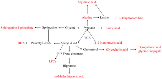 Twenty–two biomarkers associated with AGA were found and identified in the plasma of an SUC–induced AGA rats model. Three of these biomarkers are related to amino acid metabolism. Amino acids are most common in humans, and their metabolic processes and metabolites are involved in human immune and inflammatory responses [22]. Free amino acids in plasma are regulators of various metabolic pathways, and they play important roles in the biosynthesis and decomposition of various metabolites [23]. Alanine, a free amino acid in plasma, is one of the natural 20 amino acids that form human proteins. Mahbub et al. identified a significant positive correlation between alanine levels and gout. In the AGA model group, alanine levels were significantly higher than those in the blank group [24]. The primary clinical manifestation of gout is hyperuricemia, which is caused by abnormally high levels of uric acid [24,25]. 2-Ketobutyric acid is a substance that is involved in the metabolism of many amino acids (glycine, methionine, valine, leucine, serine, threonine, isoleucine). It can be converted into propionyl-CoA, and thus enter the citric acid cycle. Metabolism of 2–ketobutyric acid directly affects the normal metabolism of other amino acids, such as glycine. Glycine has a significant anti-inflammatory effect by inhibiting the activation of the nuclear transcription factor NF–κB, the degradation of IKB–α, and the production of IL–6 [26]. Plasma 2–ketobutyric acid level was decreased in model group rats, which affected the normal metabolism of glycine and led to a decreased anti–inflammatory effect. Arginine is also an important amino acid. Arginine metabolism is susceptible to increases of guanidine compound levels, resulting in its citrullination and conversion to citrulline. The citrullination process is common in pathological conditions such as rheumatoid arthritis and inflammatory joint diseases [27]. The decrease of arginine level in this experiment may be explained by the deepening of citrullination caused by AGA. In addition, it has been reported that the degradation of amino acids may be aggravated during inflammation [28].