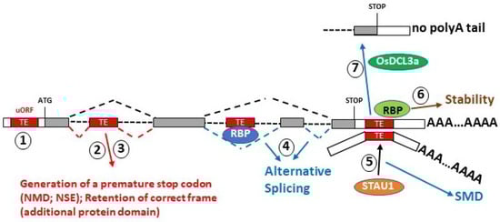 - Shen, J.; Liu, J.; Xie, K.; Xing, F.; Xiong, F.; Xiao, J.; Li, X.; Xiong, L. Translational repression by a miniature inverted-repeat transposable element in the 3’ untranslated region. Nat. Commun. 2017, 8, 14651. [Google Scholar] [CrossRef]