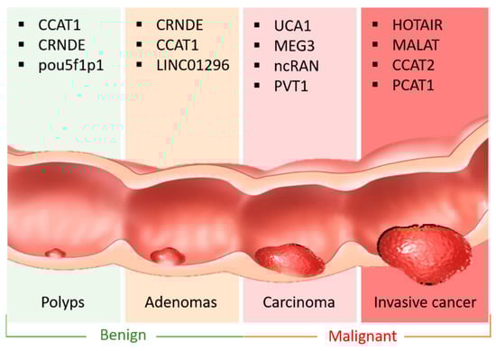 LncRNAs, defined as transcripts longer than 200 nucleotides, are not translated into proteins []. LncRNAs, aberrantly expressed in various types of cancer cells, play a vital role in several common hallmarks of cancer []. In general, lncRNAs exert regulatory functions at different levels of gene expression, including chromatin modification, transcription, and post-transcription. As for chromatin modification, lncRNAs interact with chromatin remodeling complexes to induce heterochromatin formation in specific genomic loci, resulting in reduced gene expression. Moreover, lncRNAs modulate transcription by interacting with RNA-binding proteins and co-activators of transcriptional factors, or by regulating the major promoters of their target genes. Mechanically, lncRNAs exert their regulatory effects through communication with DNA, mRNAs, ncRNAs, and proteins, serving as different functional molecules, such as signals, decoys, scaffolds, and guides in various cancer-related cellular processes [,]. Previous studies reported that lncRNAs work mainly as signaling molecules in many important CRC-related pathways, or as scaffold guides to decoy CRC-specific protein partners, as well as a cis- and trans- regulator element for gene expression. For example, the oncogenic lncRNAs mapped to chromosome 8q.24, such as CACS11, CCAT family, and PVT1, promote CRC progression by interacting with proteins to stimulate myc or other Wnt target gene expression at the posttranslational level []. Furthermore, lncRNAs (Figure 1) are frequently involved in different stages of CRC from precancerous polyps to distant metastasis, which could be considered potent diagnostic biomarkers [,]. In recent years, increasing studies have demonstrated the existence of lncRNA-mediated competitive RNA crosstalk in CRC progression (Table 1).