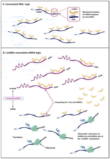 The competitive endogenous RNA (ceRNA) mechanism. (A) In the conventional crosstalk of RNA transcripts, in the cytoplasm, miRNAs exert the suppressive function on protein-coding mRNAs by base pairing with partial complementarity via the miRNA recognition element (MREs) mapped to the 3′UTR of mRNAs. (B) Under the ceRNA mechanism in cancer cells, aberrantly expressed long noncoding RNAs (lncRNAs) with MREs competitively sequestrate miRNAs and reduce the interaction between miRNA and mRNA, and thus attenuate the repression on the downstream mRNAs.