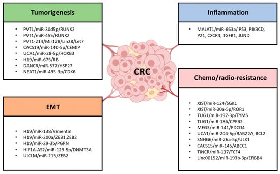 The lncRNA-associated ceRNA networks affect the four common hallmarks of colorectal cancer. Representative lncRNA‒miRNA‒mRNA networks are listed, which highlighted the involvement of lncRNA-ceRNA networks in four major hallmarks of CRC: tumorigenesis, EMT formation, inflammatory process and chemo-/radioresistance.