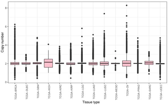 Chromosomal copy number by tissue type—A box-plot summarising mean genome-wide copy number for all samples in the 14 tissue types featured in our pan-cancer dataset. Copy number values were converted from segment mean sourced via TCGA/GDC data. A legend for the featured tissue types is available in the methods section.