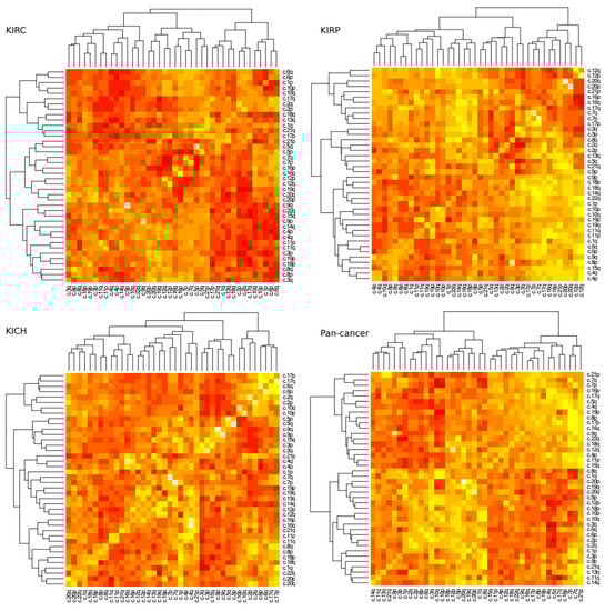 Arm ploidy correlational heat maps. Taking the Pearson correlation coefficient as our measure, we visualise the correlation of gain and loss of copy number for each chromosome arm pair in each of our kidney datasets and in our pan-cancer data. Bright yellow tiles denote highly positive correlation and dark red tiles denote highly negative correlations. The results along the diagonal (which report, for example, of the correlation of c.1p–c.1p) are normalised to r = 0 to improve overall contrast).