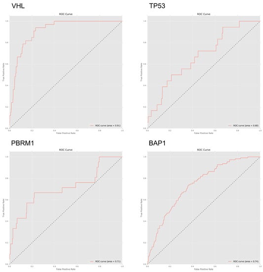AUC ROC curves used to measure the performance of random forest classifiers trained on arm-wise chromosome copy number patterns to predict gene mutation status of VHL, TP53, PBRM1 and BAP1. A larger area under the ROC indicates better performance.