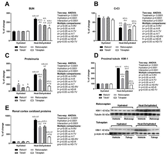 Relcovaptan and tolvaptan conferred nephroprotection in heat stress-dehydrated rats rehydrated with a 10% fructose beverage. (A) Blood urea nitrogen (BUN) was increased by heat stress and rehydration with a fructose beverage; relcovaptan and tolvaptan treatments prevented this effect. (B) Creatinine clearance (CrCl) was significantly decreased by heat stress and rehydration with a fructose-containing beverage; relcovaptan and tolvaptan treatments partially prevented this effect. (C) Proteinuria, (D) proximal tubule KIM-1 expression, and (E) oxidative stress were increased by heat stress and fructose beverage rehydration. Relcovaptan and tolvaptan treatments prevented such effects, with tolvaptan being more effective. For western blotting, three random samples per group were selected. Proteins of interest and the respective loading controls were run independently at the same time using the same conditions. The raw dataset is available in the Supplementary Materials.