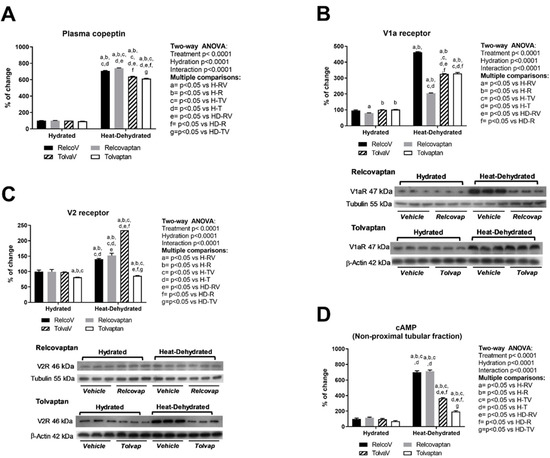 All heat-dehydrated groups rehydrated with a fructose-containing beverage had a six- to sevenfold elevation in vasopressin secretion (as measured by plasma copeptin) compared with the respective non-dehydrated groups (Figure 2A). Two-way ANOVA showed statistical significance by treatment, hydration state, and the interaction between the two factors (Figure 2A). Figure 2C,D shows that treatment with tolvaptan blocked the expression of the V2 receptor and decreased its downstream signaling molecule, cAMP. No effect on V1a receptor expression was observed in the tolvaptan groups (Figure 2B). Relcovaptan only blocked V1a receptor expression, showing that the agents were specific for their targets (Figure 2B).