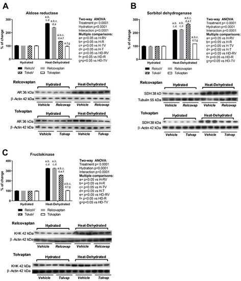 Aldose reductase (Figure 3A), sorbitol dehydrogenase (Figure 3B), and fructokinase (Figure 3C) expressions were increased by heat-induced dehydration and rehydration with fructose. Tolvaptan treatment prevented the overexpression of sorbitol dehydrogenase and fructokinase. Relcovaptan had a mild effect on aldose reductase overexpression (−12%), while tolvaptan fully prevented this effect. Two-way ANOVA analysis showed statistical significance by treatment, hydration state, and the interaction between the two factors for all these parameters (Figure 3).