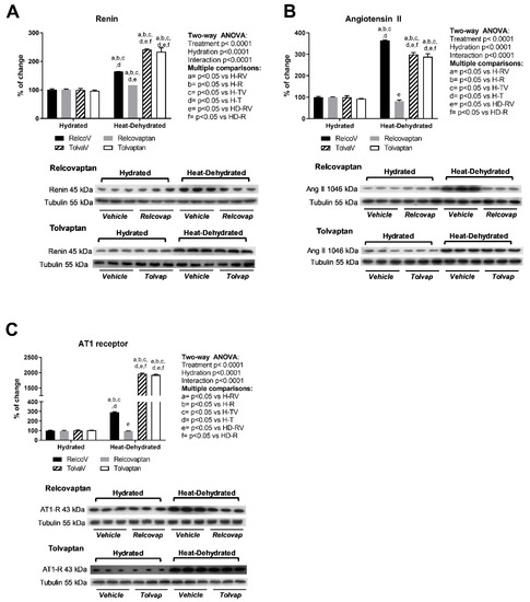 Effects of relcovaptan on the renin–angiotensin system. Heat stress and rehydration with a fructose-containing beverage induced the overexpression of renin (A), angiotensin II (B), and AT1 receptor (C). Tolvaptan prevented such effects. For western blotting, three random samples per group were selected. Proteins of interest and the respective loading controls were run independently at the same time using the same conditions. The raw dataset is available in the Supplementary Materials.