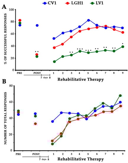 Effectiveness of the treatment with GH and rehabilitation. Animals treated with GH (LGH1, red graph) or vehicle (LV1, green graph) immediately after cortical ablation. Results obtained in the paw-reaching-for-food task with the preferred paw (impaired paw) at the presurgical phase, (PRE), 7 dpi (days post-injury) (POST) and rehabilitative therapy (at 8 dpi). (A) Mean percentage of successful responses (successful responses/total number of responses). (B) Mean of the total number of responses (successful plus unsuccessful with both paws). The rehabilitative therapy consisted in the obliged use of the impaired paw, in daily sessions of 3 min for nine consecutive days. Significance levels are done with respect to the sham-operated control group (CV1, blue graph). *** p < 0.001; ** p < 0.005; * p < 0.01 (Bonferroni test). The x-axis indicates days.
