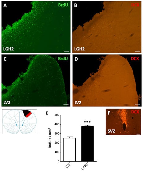 In previous studies, we demonstrated that the lesion of hippocampus with kainic acid stimulated the proliferation of neural precursors in the hippocampus, and that this effect was significantly enhanced by the administration of GH [24]. In view of these findings, in this study some injured rats treated with vehicle (LV2) or GH (LGH2) were injected with BrdU using a saturation protocol (100 mg/kg), as in our previous study [24], and euthanized at 5 dpi (Figure 11B); these animals did not receive rehabilitative therapy before being sacrificed.