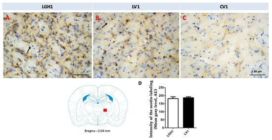 In the thalamus of animals treated with GH (LGH1 group) or vehicle (LV1 group), nestin expression was detected in the thalamic ventral nucleus, ipsilateral to the lesion (ventrolateral, VL, and anterior ventral, VA, nuclei). This expression of nestin was observed in fibrillar structures, probably corresponding to prolongations of microglia cells, being similar in groups LGH1 and LV1 (Figure 7A,B,D). Conversely, no nestin-ir was observed in the thalamus contralateral to the lesion. In controls, the expression of nestin was restricted to blood vessels (Figure 7C).