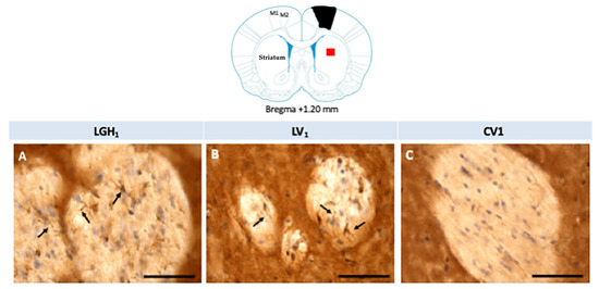 Nestin expression in the striatum ipsilateral to the lesion of animals sacrificed at 25 dpi. Nestin re-expression in the striatum ipsilateral to the lesion of animals belonging to the three experimental groups LGH1 (A,D), LV1 (B,E) and CV1 (C,F). The three microphotographs to the right correspond, in each experimental group, to the red box indicated in the scheme. Coronal sections at +0.96 mm from Bregma. The arrow in (A) points to a reactive astrocyte at the striatal white matter. The arrows in (D,E) point to nestin+ neurons in the striatal gray matter. The re-expression of nestin in the striatum was observed from AP = +2.52 mm to AP = −0.12 mm with respect to bregma. Scale bar = 100 µm. In the scheme, the black trapezoid indicates the place where the lesion was produced.