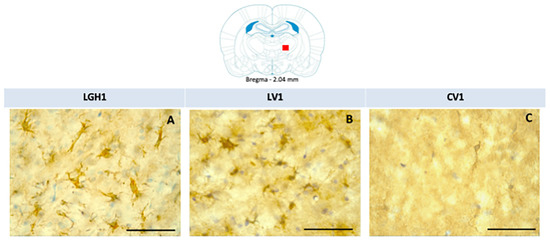 Actin expression was detected in the striatum, ipsilateral to the lesion, of animals treated with GH (LGH1) or vehicle (LV1), but this expression of actin was similar in both groups, as Figure 8 shows. Fine fibers, actin+, were observed in the striatal white matter of rats treated with GH (LGH1) or vehicle (LV1) (Figure 8A,B). In control animals (CV1), no actin immunostaining was observed in the striatum (Figure 8C). No actin expression was observed in the striatum contralateral to the lesion in any of the groups studied.