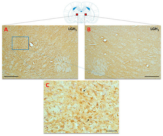 In the thalamus of animals treated with GH or vehicle, actin expression was detected in the ventral nucleus (VL and VA nuclei), ipsilateral to the lesion (Figure 9), but not in the contralateral hemisphere (Figure 10). Actin expression was located in cells of poorly defined limits, with a robust structure and with few short and irregular prolongations; the morphological characteristics were similar to activated microglia/macrophage cells (Figure 9A,B and Figure 10C). No actin immunoreactivity was detected in controls (Figure 9C).