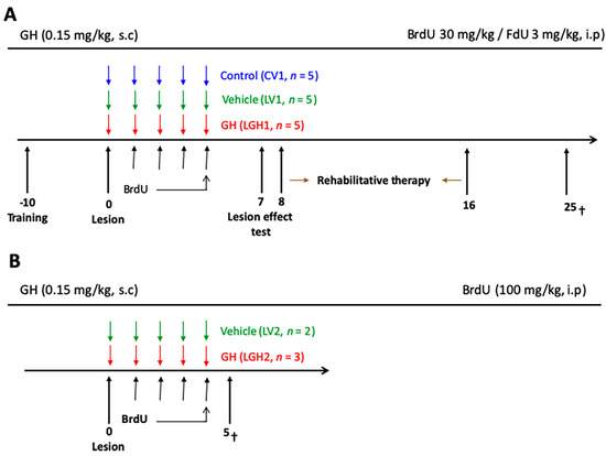 The experimental design consisted of the following phases: (i) presurgical behavioral test; (ii) ablation of the frontal cortex; (iii) treatment with vehicle (LV1 and control group CV1) or GH (LGH1), subcutaneously (s.c), immediately after the cortical ablation, and intraperitoneal (ip) BrdU/FdU administration, followed by rehabilitative therapy beginning at 8 dpi and carried out for nine days; these study phases are schematically represented in Figure 11A. Surgical procedures and sacrifice were carried out under deep anesthesia with Equithesin (Chloral hydrate/magnesium sulfate/pentobarbital sodium; 20 mg/kg, ip,). The animals were sacrificed 25 days post-injury. Other animals (n = 5) received likewise vehicle (LV2, n = 2) or GH (LGH2, n = 3) immediately after the lesion, and BrdU, but they were sacrificed at 5 dpi (Figure 11B), without receiving rehabilitative therapy.
