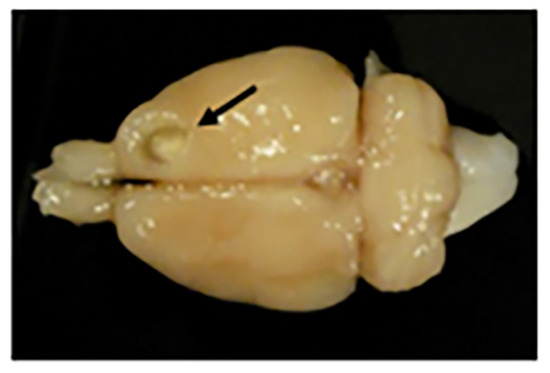 Motor frontal cortex ablation. Photograph of a rat brain with a motor cortex ablation (shown with a black arrow). At the bottom of the lesion is a slightly paler shade that corresponds to the corpus callosum (or white matter).