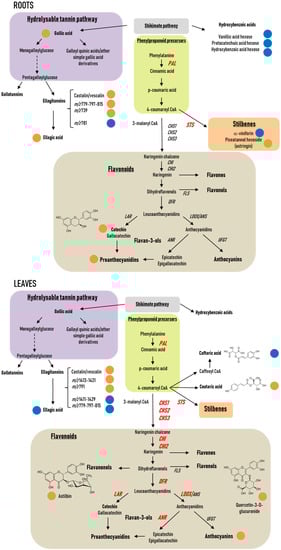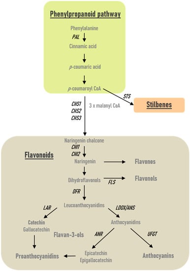 General phenylpropanoid and flavonoid biosynthesis pathways in plants. Phenylalanine ammonia-lyase (PAL), which catalyzes the first step of the phenylpropanoid pathway, a stilbene synthase (STS), three chalcone synthase (CHS1, CHS2, CHS3), two chalcone isomerase 1 and 2 (CHI1, CHI2), a flavonol synthase (FLS), one dihydroflavonol reductase (DFR), two leucoanthocyanidin reductase (LAR1, LAR2), an anthocyanidin reductase (ANR), a leucoanthocyanidin dioxygenase (LDOX), and an UDP-glucose: flavonoid 3-O-glucosyl transferase (UFGT) were studied in the present work and localized here in the general biosynthesis pathway.