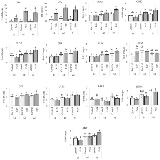 In leaves, no significant difference was observed in transcript accumulation for FLS1 LAR2 and UFGT in response to PsJN (Figure 5). However, the expression of CHS1, CHS2, CHS3, CHI, CHI2, LAR1, ANR, and LDOX was up-regulated in bacterized plantlets four and seven days after bacterization. For PAL and STS, a significant overexpression in response to PsJN was observed only seven days after bacterization.