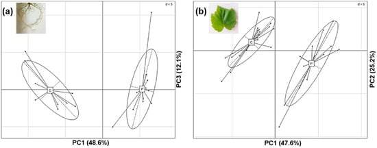 Comparison of root and leave phenolic profiles between control and bacterized plantlets. Principal component analysis (PCA) performed on chromatographic data obtained for each methanolic extract of grapevine after inoculation or not with PsJN. Analyses were based on peak areas and retention times. This figure represents both the data obtained in the first and second biological repetitions. Each point represents the extract of pooled samples of the same treatment (nine plants/pool). (a) Root extracts (C = control plants, n1 = 5 + n2 = 4; P = PsJN inoculated-plants, n1 = 8 + n2 = 4; data matrix of 85 peaks); (b) Leave extracts (C = control plants, n1 = 9 + n2 = 11; P = PsJN inoculated-plants, n1 = 9 + n2 = 4; data matrix of 32 peaks). n1: number of replicates in the first biological repetition; n2: number of replicates in the second biological repetition.
