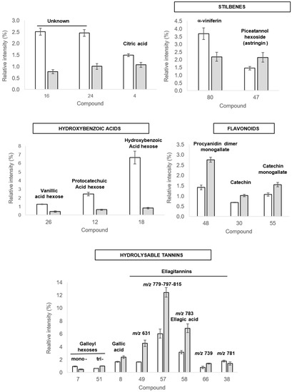 - Sanz, M.; de Simon, B.F.; Cadahia, E.; Esteruelas, E.; Munoz, A.M.; Hernandez, T.; Estrella, I.; Pinto, E. LC-DAD/ESI-MS/MS study of phenolic compounds in ash (Fraxinus excelsior L. and F. americana L.) heartwood. Effect of toasting intensity at cooperage. J. Mass Spectrom. 2012, 47, 905–918. [Google Scholar] [CrossRef]