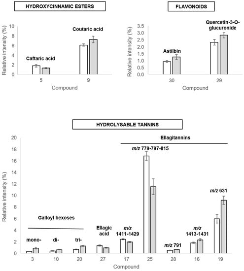 Hydroxycinnamic esters. In leaves extracts analyses, two discriminant peaks [L5; L9] showed UV-vis spectra characteristic of hydroxycinnamic acid (HCA) derivatives, with major λmax at 322 nm (298 sh) and 312 nm (295 sh), respectively (Table 2). They were observed as precursor ions [M-H]− at m/z 311.0411 and at m/z 295.0457, and both showed product ions due to the loss of 132 uma (corresponding to the loss of a tartaric acid moiety) observed at m/z 179.0332 (which could be caffeic acid) and at m/z 163.0386 (coumaric acid), respectively. Other product-ions were observed at m/z 149.0085 (tartaric acid), produced due to the loss of the HCA moiety (caffeic or coumaric acid), and at m/z 135.0439 or m/z 119.0498, respectively, derived from the decarboxylation of the HCA moiety. As these data were in accordance with fragmentation patterns described in the literature, these compounds [L5; L9] were assigned to caffeoyl-tartaric (caftaric) and coumaroyl-tartaric (coutaric) acids, respectively, without isomer type determination [,,]. Two other hydroxycinnamoyl tartaric acids were detected in the leaves extracts (compounds [L6; L13] as a coutaric and fertaric acid isomers, respectively) but were not discriminant compounds.
