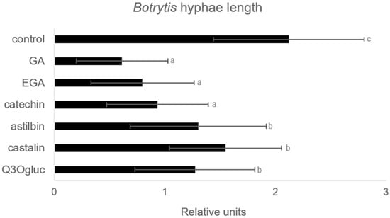 Effect of molecules on Botrytis cinerea development. Conidia were placed in growth medium supplemented with solutions of molecules at 0.1 mg/mL. The length of germ tubes was observed by inverted light microscopy 8 h later and measured using Image J. GA, gallic acid; EGA, ellagic acid; Q3Ogluc, quercetin-3-O-glucuronide. Different letters above each bar indicate significant differences (p < 0.05), as determined by Tukey’s analysis.