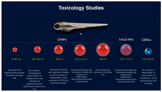 | Ch/zinc-oxide nanoparticles (CZNC) | >250 mg/L | 120–150 nm | No cardiotoxic or neurotoxic effects and minor hepatotoxic effect | Organ-specific toxicity (cardiac, hepatic, and neuromuscular) | [192] |