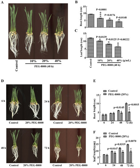 To investigate wheat seedling growth under drought conditions, PEG-8000 was used to induce drought stress. After treatment with 20–40% PEG-8000 for 48 h, a significant decrease in root and leaf size was observed compared with the control (Figure 1A–C). Moreover, this decrease increased with increasing concentration of PEG-8000. Similarly, a significant decrease in both parameters was also observed after treatment with 20% PEG-8000 for 48–72 h, with a greater decrease in growth with increasing duration (Figure 1D–F). These findings suggest that PEG-8000-induced drought stress repressed seedling growth of wheat cultivar Jimai 22 in both a time- and concentration-dependent manner.