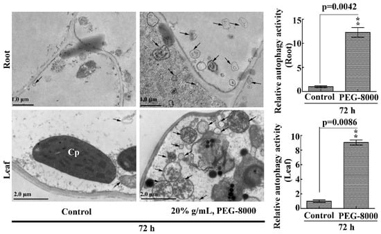 TEM images of autophagic structures in the leaves and roots. Representative ultrastructure of the autophagic bodies (arrows) in the roots and leaves. The relative autophagic activity under 20% PEG-8000 treatment for 72 h was normalized to that of the control plants treated with water only. Approximately 10 cells were used to quantify the autophagic structures under each treatment. Cp, chloroplast; Nu: nuclei. Scale bars = 1 μm (upper images) and 2 μm (lower images). Values in the graphs represent the mean relative activity ± SD of three independent experiments. ** indicates a significant difference at p < 0.01 according to Student’s t-test.
