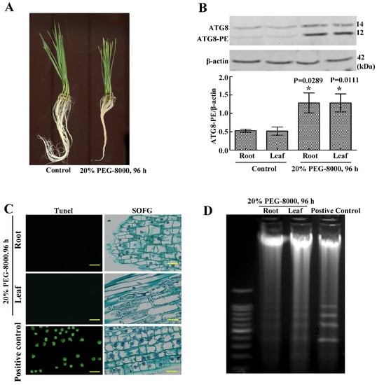 To study whether wheat seedlings undergo PCD when autophagy occurs, TUNEL staining and DNA ladder analysis were performed. Results showed that the 20% of the PEG-8000-treated (96 h)-wheat seedlings looked wilting, and the expression of ATG8-PE had a significant increase (Figure 5A,B), which suggested that the autophagy worked. However, DNA ladder detection and TUNEL staining showed that the classical features of PCD (green nuclei stained by TUNEL) were not observed in both the roots and leaves of wheat seedlings (Figure 5C,D). These data suggest that the roots and leaves of wheat seedlings survive when autophagy occurs.