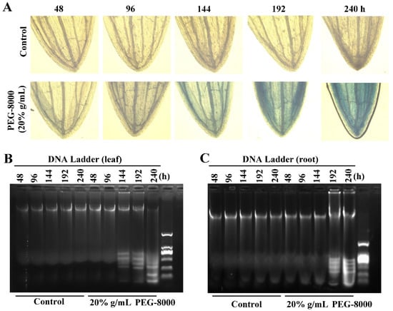 PCD in wheat seedlings following long-term treatment with PEG-8000. (A) Trypan blue staining of leaves following treatment with 20% PEG-8000 for 48, 96, 144, 192, and 240 h. (B–C) DNA ladder assay of PCD in the leaves and roots following long-term treatment with 20% PEG-8000, respectively. Control: treatment with water. Data represent the results of three experiments.