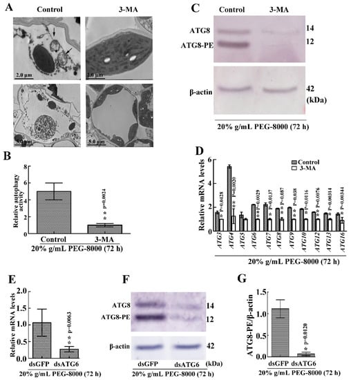 The barley stripe mosaic virus (BSMV)-based VIGS method was used to create gene knockdown plants [50]. A 300 bp fragment of ATG6 from the conserved coding sequence was amplified and purified, with a 300 bp fragment of GFP used as a control. The γ strand of BSMV was then digested in XmacI and fused with the ATG6 or GFP fragment to form the vectors BSMVγ-ATG6 and BSMVγ-GFP, respectively. BSMV-α was linearized with MIuI, BSMV-β was linearized with SpeI, and BSMVγ-ATG6 and BSMVγ-GFP were linearized with BssHII. The linearized vectors were then transcribed in vitro to produce 5ʹ-capped infectious BSMV RNA molecules using the RiboMAX Large Scale RNA Production-T7 Kit (Promega, Madison, WI, USA) with the addition of a cap analog (Promega, Madison, WI, USA) to the transcription mixture. Leaves obtained five days after germination were then mechanically infected with a 1:1:1 mixture of RNAα, RNAβ and RNAγ-ATG6, or RNAγ- GFP in 1 × GKP buffer (50 mM Gly, 30 mM K2HPO3, 1% bentonite and 1% kieselguhr). Three replications of each experiment were conducted, with a total of 20 seedlings per each BSMV:ATG6 and BSMV:GFP treatments. After 4 days of BSMV treatment, the seedlings were then treated with 20% (g/mL) PEG-8000 for 72 h. To confirm knockdown efficiency, five plants were randomly selected from each of the two treatments, and the transcript levels of ATG6 in the first leaves were determined using qRT-PCR.