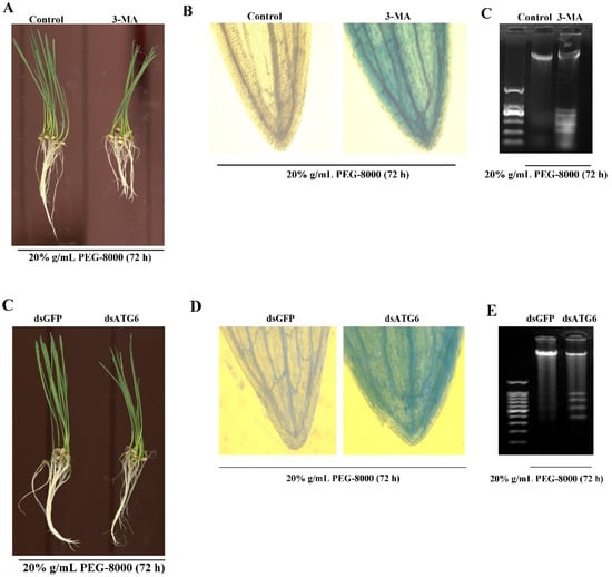 To confirm whether autophagy results in cell survival or cell death, 3-MA, a potent inhibitor of phosphoinositide 3-kinase that inhibits the formation of autophagic structures [17], was used to block autophagy. The effect of knocking down ATG6 expression was also examined. TEM observations also revealed a significant decrease in autophagic vacuoles after 3-MA treatment (Figure 7A,B), while the Western blot assay revealed a great decrease in ATG8-PE (Figure 7C). Moreover, qRT-PCR showed a decrease in the expression of autophagy-related genes (ATG3, 4, 6, 7, 8, 9, 10, 12, 13, and 16) following the addition of 3-MA (Figure 7D). Western blot showed that ATG8-PE had a significant decrease after the knockdown of ATG6 (Figure 7E–G). These findings confirm that the addition of 3-MA and the knocking down of ATG6, respectively, inhibit PEG-8000-induced autophagy. Wilting was observed compared with the control following the addition of 5 mM 3-MA for 72 h and the knockdown of ATG6 (Figure 8A,C). Trypan blue staining and a DNA ladder assay of the leaves also revealed cell death following the addition of 3-MA and the knocking down of ATG6 (Figure 8B–E). Taken together, these findings suggest that the inhibition of PEG-8000-induced-autophagy leads to cell death in wheat seedlings, with autophagy acting as a survival process.