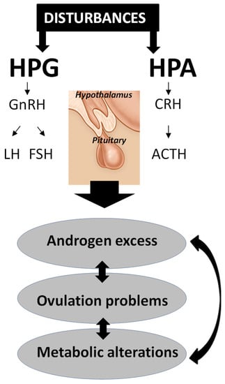 Disturbances at the hypothalamic–pituitary–gonadal (HPG) and hypothalamic–pituitary–adrenal (HPA) glands’ axes can lead to androgen excess, and consequently, anovulation and/or metabolic diseases, all three of which are the main symptoms of polycystic ovary syndrome (PCOS). GnRH—gonadotropin releasing hormone; CRH—corticotrophin releasing hormone; LH—luteinizing hormone; FSH—follicle stimulating hormone; ACTH—adrenocorticotropic hormone.