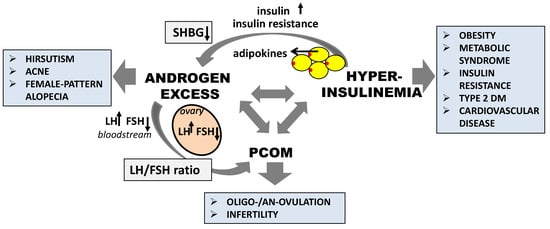 It can be assumed that PCOS is a collection of symptoms arising from an excess of androgens []. Hyperandrogenism or excessive androgen levels are clinically manifested by features such as hirsutism, acne, and female-pattern alopecia. There is an inseparable connection between high androgen levels, anovulation, and insulin metabolism in women with PCOS (Figure 2). Hyperandrogenism is also associated with androgen synthesis and secretion by theca or zona reticularis cells []. However, hyperandrogenemia in patients with PCOS means elevated T and insulin concentrations in peripheral circulation, together with insulin resistance in the ovarian tissue. The circulating free androgen levels, especially T, are indirectly increased by two independent mechanisms. The excessive insulin concentration and insulin resistance stimulate the ovarian and adrenal secretion of the androgens and inhibit the hepatic production of SHBG []. The consequence of these hormonal changes can be premature follicular atresia, chronic anovulation, and gonadotropin imbalance, which was manifested by an increase in LH and decrease in FSH levels, as well as an LH:FSH ratio above 2.5 []. Moreover, ovarian androgen synthesis in PCOS, increased by insulin, seems to stimulate the granulose cells’ sensitivity to LH, as well as increasing the expression of the gene-encoding androgen-forming enzyme cytochrome P450c17α. Other studies have demonstrated that the theca cells of PCOS ovaries were more capable of transforming androgenic precursors to T; furthermore, the increased T production by the theca cells is more likely influenced by the excessive production of androgen precursors than by altered 17β-hydroxysteroid dehydrogenase activity [].