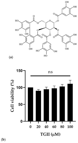 Effects of Tellimagrandin II (TGII) on cell viability in peripheral blood mononuclear cells (PBMCs). (a) Chemical structure of Tellimagrandin II; (b) PBMCs were treated with TGII at a dose ranging from 0 to 100 μM for 24 h, and the viability of the treated cells was determined using the WST-1 assay (quantitative data were measured at least three times and are presented as mean ± SD).
