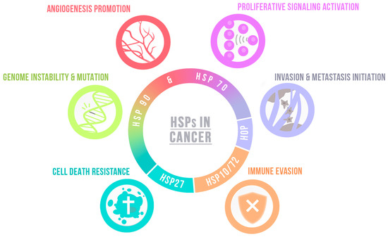 Heat shock proteins (HSPs) modulate several hallmarks of cancer. HSPs work in several mechanisms of proteostasis, features highly relevant in cancer. The figure shows a few of the roles of HSPs in cancer maintenance and are color-coordinated with the hallmark they modulate. HSP70 and HSP90 modulate angiogenesis through regulation of HIF1α and other downstream factors (red). HSP70 and HSP90 preferentially bind to mutated proteins over their wild-type counterparts, stabilizing these molecules and contributing to mutagenesis (green). HSP90 can lead to resistance to cell death by inhibiting the activation of pro-caspase-9, HSP70 inhibits the formation of apoptosomes and pro-apoptotic factors usually released, and HSP27 can inhibit pro-caspase-9 through alternative mechanisms (blue). To evade the host immune system, HSP10 suppresses T-cell activation through T-cell CD3-zeta downregulation, while HSP72 decrease sT-cell proliferation (orange). HSP90 is increased in metastatic tumors and interacts with MMP2, promoting epithelial–mesenchymal transition. HSP70 modulates factors working on cell migration and HSP-organizing protein (HOP), a HSP90/HSP70 co-chaperone, and regulates invasion through MMP2 activation (violet). HSP90 can also modulate self-sufficiency in growth signals, stabilizing several molecules involved in cell proliferation pathways, driving tumor progression and HSP70 through its interaction with ERα, leading to an increased growth in specific tumors (purple).
