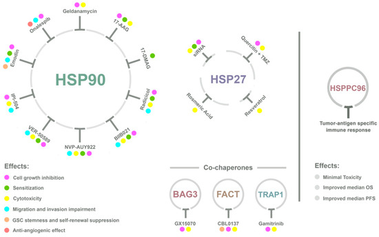Heat shock proteins (HSPs) targeted for distinct therapeutic approaches anti-GBM. New strategies involve the use of active immunotherapy and HSP-targeting drugs. The most abundant are HSP90 and HSP27 inhibitors, with a few examples of molecules against co-chaperones. The main effects elicited by HSP inhibitors on GBM are cell growth inhibition, radio- and/or chemo-sensitization, cytotoxicity, migration and invasion impairment, glioma stem cells (GSCs) stemness and self-renewal suppression, and anti-angiogenic effect. Vaccines against GBM target the heat shock protein–peptide complex-96 (HSPPC-96) and clinical trials demonstrate that the vaccination causes a tumor antigen-specific immune response on the host, with minimal toxicity and improvement of median overall survival (OS) and median progression-free survival (PFS). Abbreviations: 17-AAG, 17-allylamino-17-435 demethoxygeldanamycin; 17-DMAG, 17-dimethylaminoethylamino-17-demethoxygeldanamycin; IPI-504, Retaspimycin hydrochloride; siRNA, Small-interference RNA; TMZ, temozolomide.